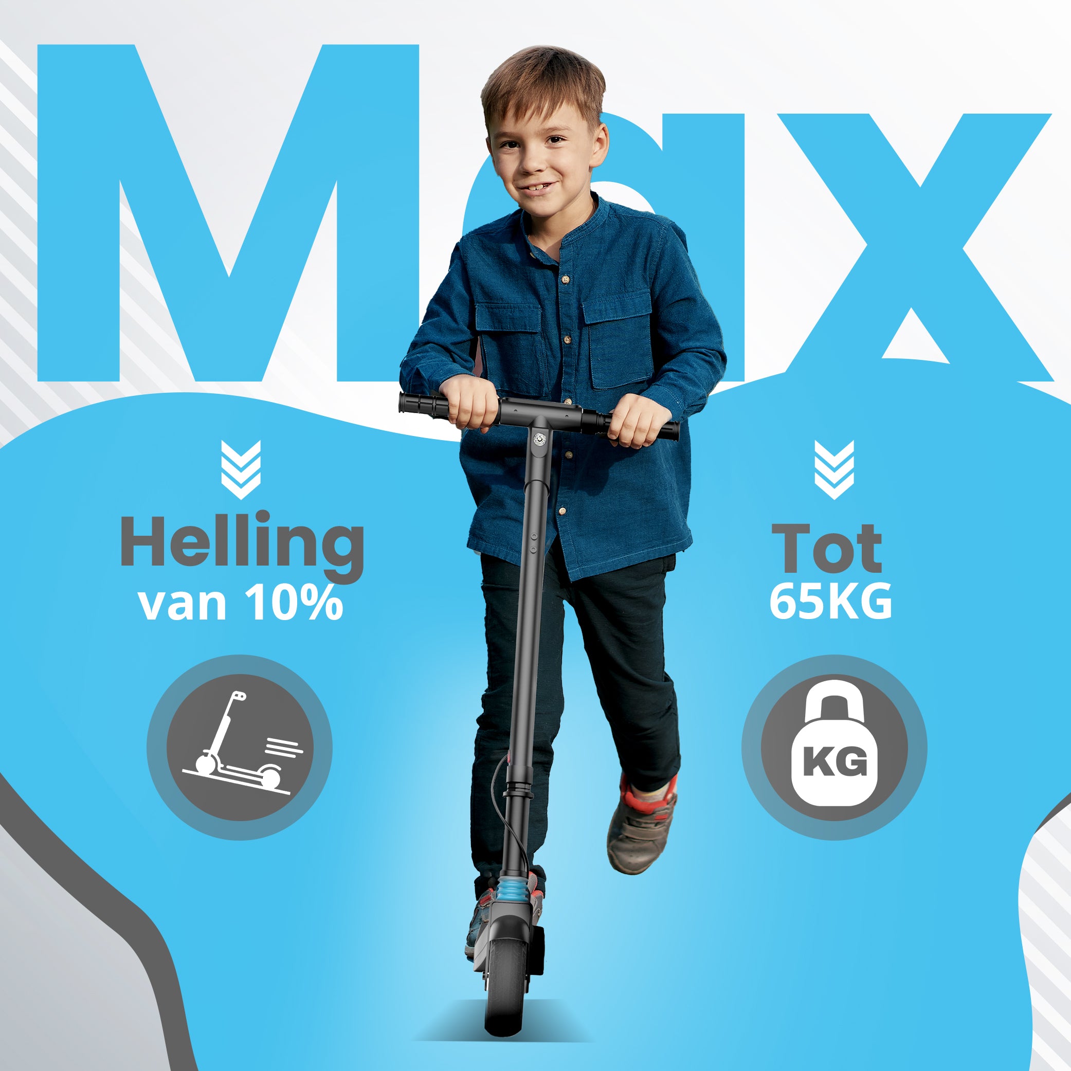Het bereik van de kinderstep is 15km (afhankelijk van de ingestelde standaard snelheid) door de krachtige en betrouwbare batterij van 2500mAh. De maximale snelheid is 15km/u maar zoals hierboven aangegeven kan dit gelimiteerd worden d.m.v. de standen. De step kan tot 65kg gewicht hebben en de step zelf heeft een gewicht van 6.65kg.
